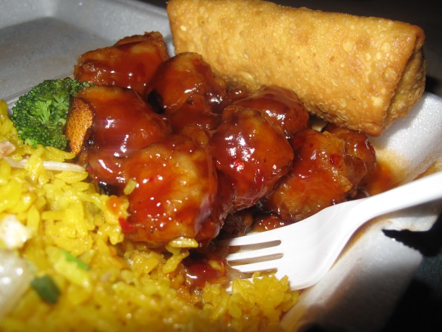 While catching up on the news I started thinking maybe I’d make some fish filets for dinner. I went to the freezer and realizing that I should have thawed the fish long before then I knew I was going to have to order out as I had nothing else to prepare for dinner. I opted for The Orange Chicken Combination Plate with “Chicken” Fried Rice instead of Pork Fried Rice.